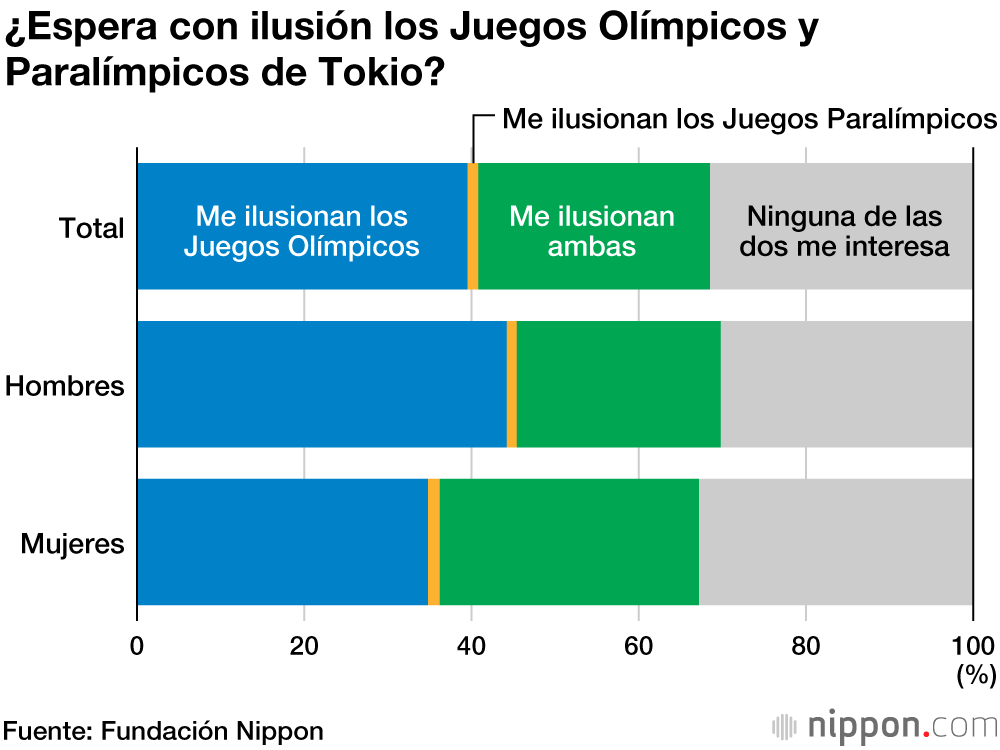 En concreto, el 39,5 % dijo estar ilusionado por los Juegos Olímpicos, el 1,3 % por los Paralímpicos, y el 27,7 % por ambos. Aproximadamente, el 70 % de los jóvenes de ambos sexos dijo esperar la competición olímpica con ilusión. No obstante, mientras que las mujeres dijeron estar igualmente emocionadas por los Juegos Olímpicos o por ambos eventos, más del 40 % de los hombres dijo estar ilusionado solo por los primeros.